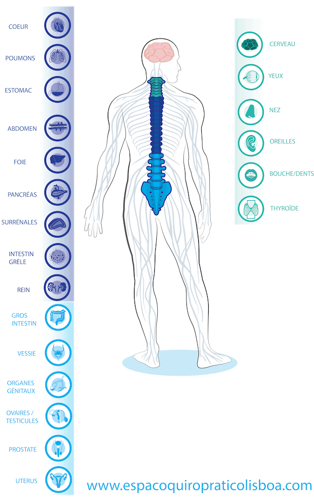 Grâce à une colonne vertébrale saine et alignée, le système nerveux permet une communication optimale de haut en bas, du cerveau au corps et nous maintient à un niveau de vitalité et de santé maximal.